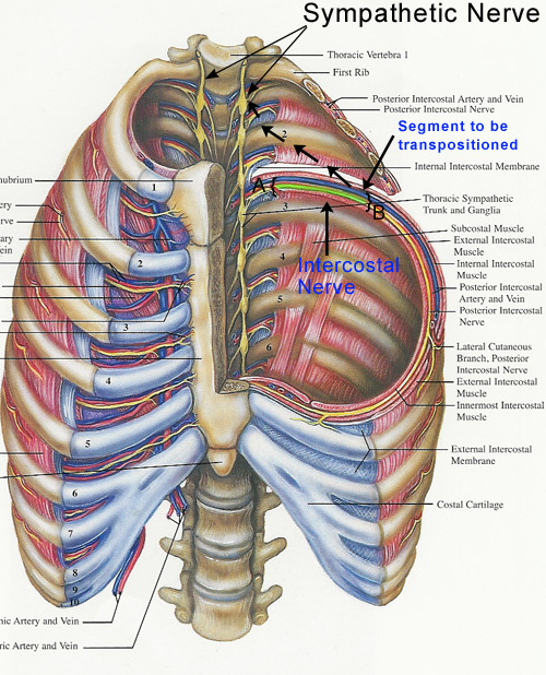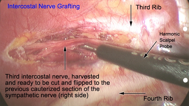 - In the picture (open diagram), one can see a harvested intercostal nerve at the third rib level. This was harvested and freed from the surrounding tissues and flipped over to the site of the previously divided sympathetic nerve. The theoretical benefit of this intercostal nerve graft, is that the blood supply is maintained to the harvested nerve. The intercostal nerve also contains some sympathetic and sensory fibers, which might add to the physiological response. Again, with this method more cases have to be done, and more follow-up is needed.